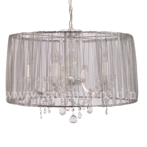 Het sierlijke in c vorm gebogen chromen armatuur van deze charmante kroonluchter is bedekt met kunststof en vastgezet met bloemrozetten. In het midden van de kroonluchter bevind zich een bewerkte glazen vaas met daarbovenop een bewerkte glazen schaal met glazen pegels. Daarop is de metalen draadkap met sjieke zilveren organza stof geplaatst. De kroonluchter hangt aan een in hoogte verstelbare metalen ketting. De meegeleverde plafondplaat is uitgevoerd in chroom.
