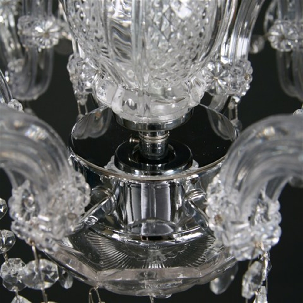 Deze kroonluchter heeft 6 lichtpunten verdeeld over 1 laag, welke elk voorzien zijn van een bewerkte glazen schaal met glazen pegels. Het sierlijk in s vorm gebogen chromen armatuur is bedekt met kunststof en vastgezet met bloemrozetten. In het midden van de lamp bevind zich een bewerkte glazen vaas met daarbovenop een bewerkte glazen schaal met glazen pegels en hangt aan een in hoogte verstelbare metalen ketting. Tussen de armen van deze mooie kroonluchter hangen glazen kettingen met glazen pegels. De bijgeleverde plafondplaat is tevens uitgevoerd in chroom.