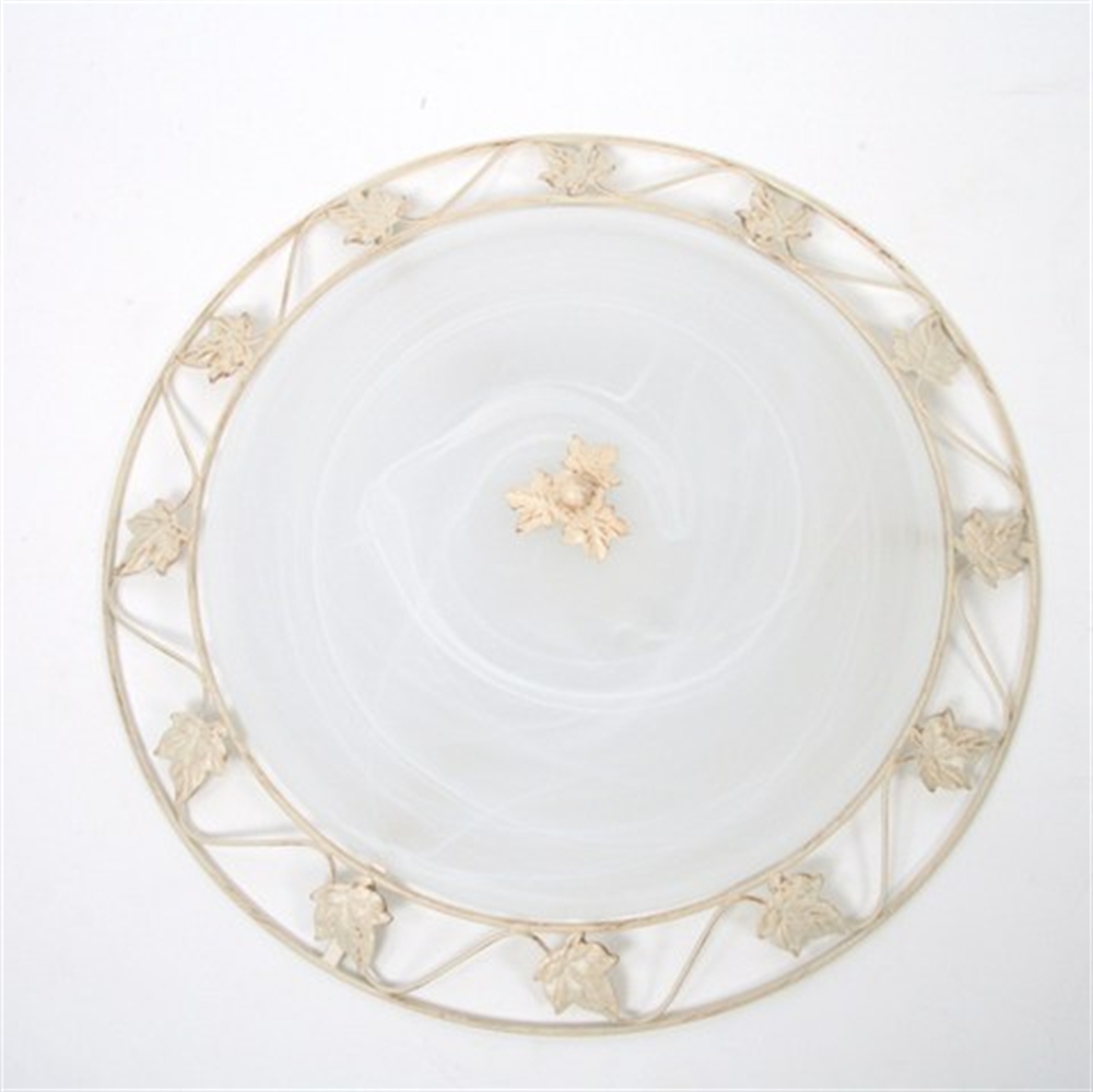 Deze plafondlamp heeft 2 lichtpunt. De kap van rond scavo glas zorgt voor goede heldere verlichting. De plafondlamp heeft met haar kunstzinnige witte metalen bladversiering een zeer decoratieve uitwerking.